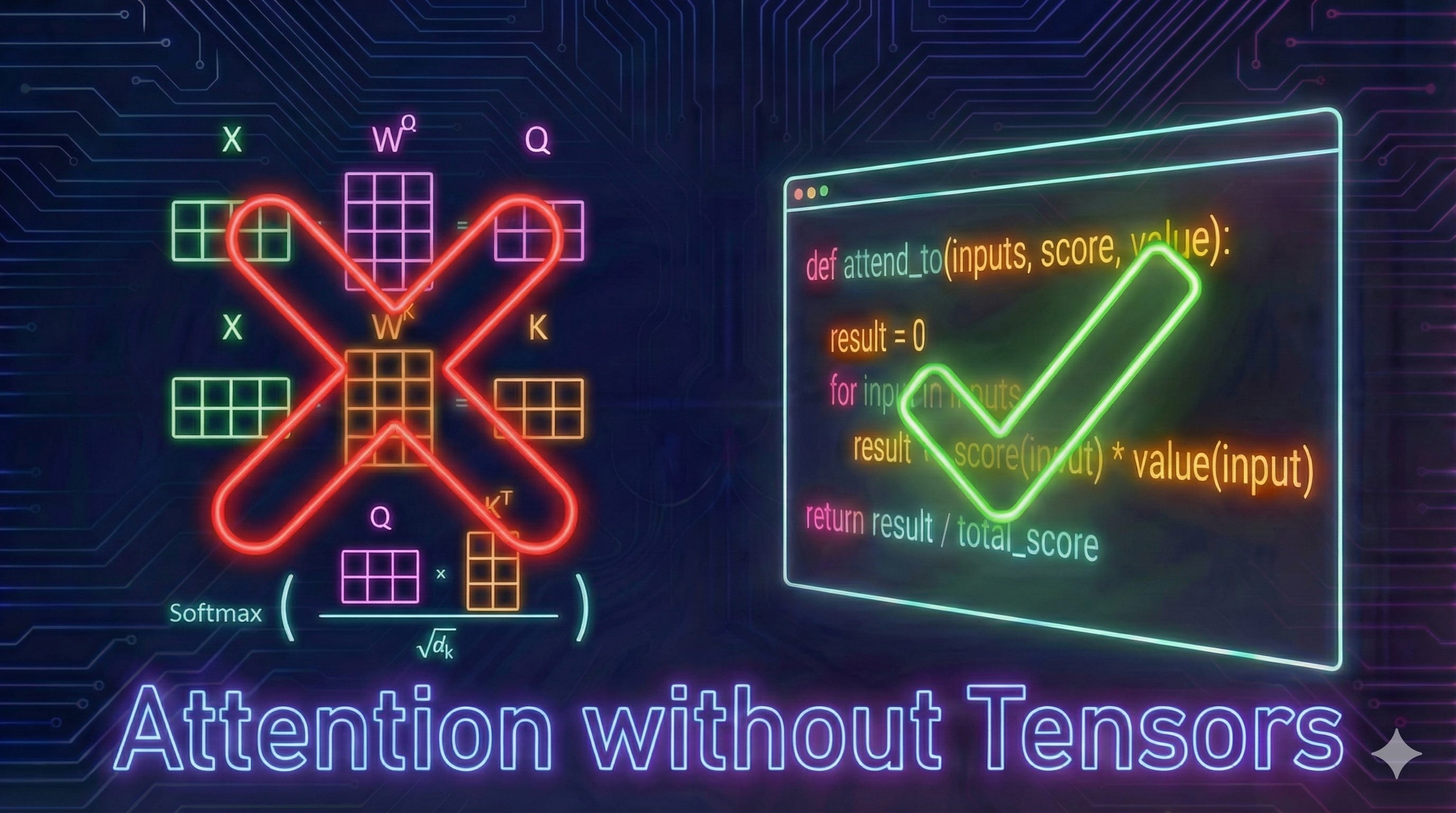 If you’ve ever tried to understand Large Language Models (LLMs), you likely ran into a wall of tensors and matrix multiplication. It’s easy to assume that without the heavy math, any explanation is doomed to be hand-wavy or imprecise. The surprising truth, however, is that we can describe the attention mechanism with total precision—without relying on tensors or linear algebra.1